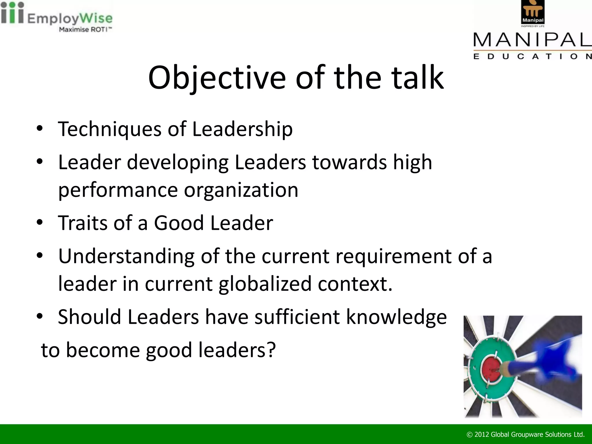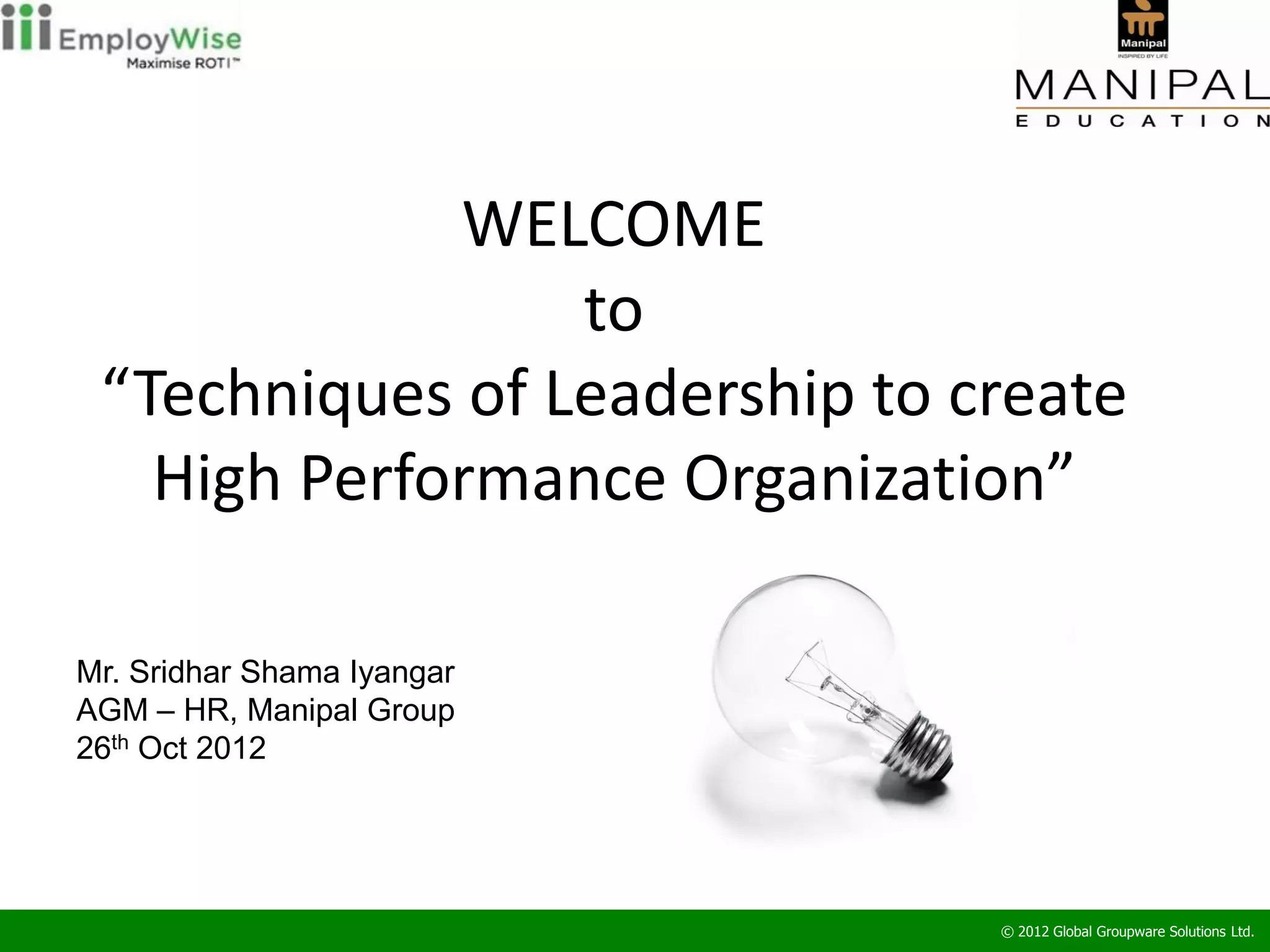 The document discusses techniques of leadership aimed at fostering high-performance organizations, emphasizing the traits and requirements for modern leaders in a globalized environment. Key points include the importance of clear vision, effective communication, and continuous employee development. Additionally, it outlines various leadership styles and the necessity for leaders to possess relevant knowledge and adaptability to succeed.