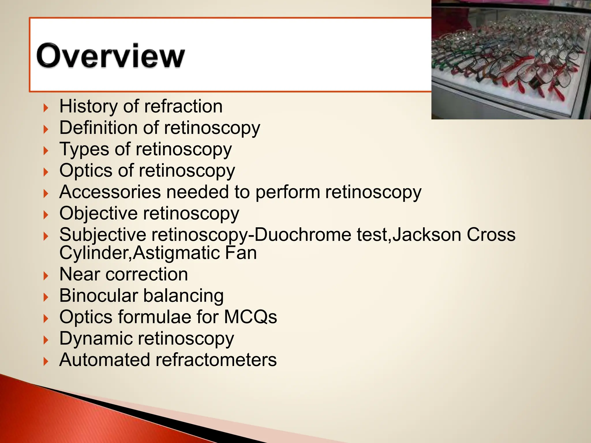 The document provides a comprehensive overview of retinoscopy, including its history, techniques, and equipment required for effective practice. Key sections cover objective and subjective retinoscopy methods, types of lenses used, and various tests like the duochrome test and Jackson cross cylinder for refining refraction. It also discusses the importance of accurately assessing and correcting refractive errors in patients, highlighting the relevance of both subjective and objective measurements in optometry.