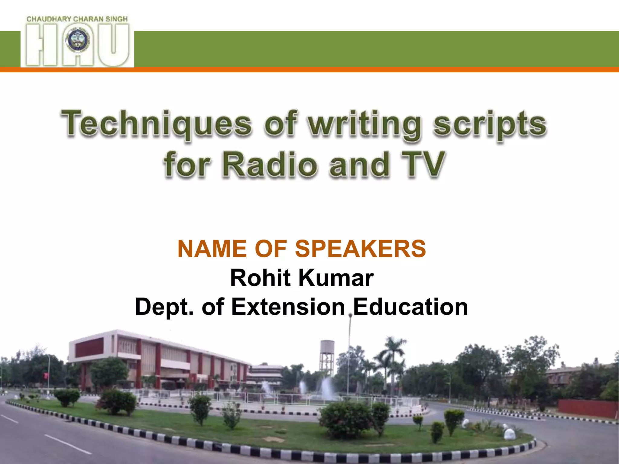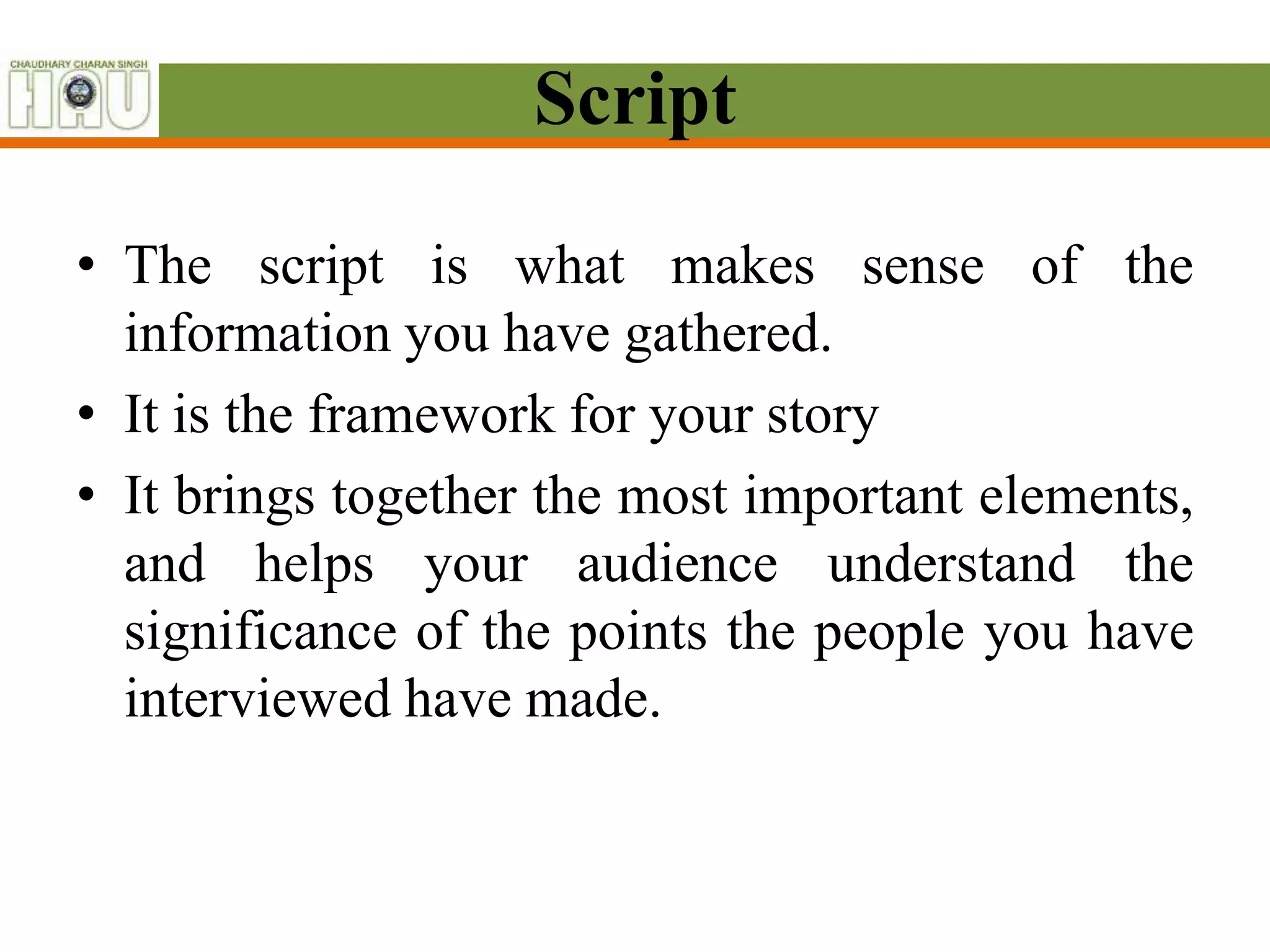The document discusses script writing for radio and television. It provides guidance on developing scripts, including defining the concept, summarizing the story, dividing it into scenes, and inserting sound effects and transitions. Key principles for radio scripts are that they are spoken, immediate, person-to-person, heard once, and rely on sound. Television scripts require selecting topics, determining main points, dividing into logical steps, rehearsing to fit the time, and deciding on visuals and music. Script writing involves following specific formatting guidelines to aid clarity and delivery for the audience.