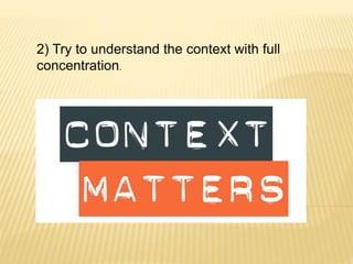 The document provides techniques for fast and effective studying. It recommends doing a thorough initial reading to understand the chapter, focusing fully to comprehend concepts, noting important points, creating mind maps, memorizing keywords, consulting teachers for unclear topics, taking breaks and eating properly to remain energized, and regularly revising materials.