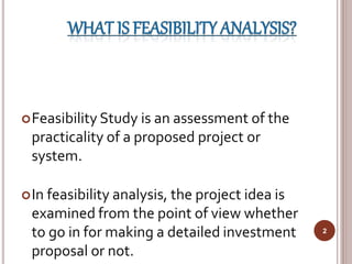 A feasibility study assesses the practicality of a proposed project by examining if it should proceed to a detailed investment proposal. It analyzes three alternatives: proceeding with feasible ideas, abandoning unfeasible ones, or collecting more data for inconclusive ones. A techno-economic feasibility study estimates project demand potential and optimal technology choice based on existing market and technology analysis. A feasibility report for a new or expanding enterprise includes background on the industry, objectives and scope, manufacturing processes, financial implications, and an implementation schedule. Key factors considered are technical, economic, financial, managerial, and implementation feasibility.