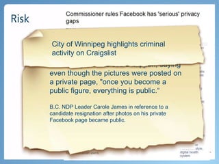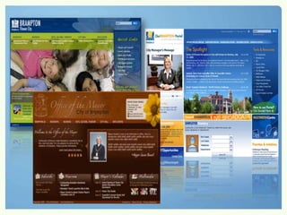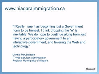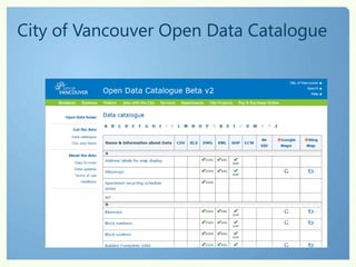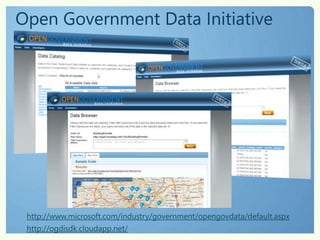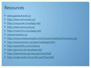 Using technology can help governments better engage citizens and meet increasing expectations with fewer resources. Examples show how governments are leveraging open data and cloud services to improve citizen services. Edmonton, Vancouver, and other cities publish data on platforms like Microsoft's Open Government Data Initiative to encourage public participation and transparency. This allows governments to deliver better services and experiences to citizens through multi-channel engagement.