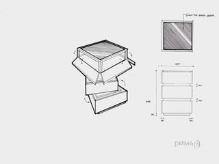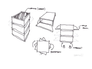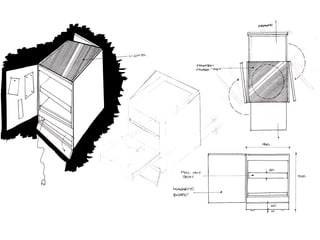 The document summarizes the development of a rotating storage cabinet called C360. It describes pains observed with existing cabinets, ideas generated during market research like adding a touchscreen and lighting, prototypes with rotating layers and wheels, and a final version with added features. The target market was businesses, households, and organizations with an initial production size of 200,000 cabinets.