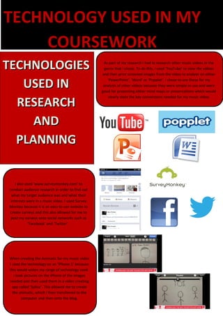 To research music videos in their chosen genre and analyze conventions, the author used YouTube to view videos and PowerPoint, Word, or Popplet to print screen images and create presentations. They also used SurveyMonkey to create and distribute surveys to gather information about their target audience's interests. When creating an animatic for their music video, the author used an iPhone 5 to take pictures and the app Splice to compile the animatic, which was then transferred to a blog.