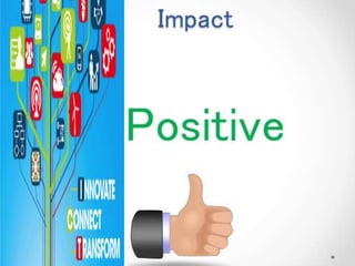 This document discusses the relationship between technology and society. It notes that technology and society are intertwined, as humans rely on technology in daily life for tasks like travel, communication, learning, and business. The document then examines how technological changes impact society both positively, through advances in transportation, communication, medicine, education, and agriculture, and negatively, through increased resource depletion, lack of social bonds, energy consumption, pollution, and issues in childhood development. It also explores how technological changes have transformed businesses through automation, mobile access, and online customer engagement. The conclusion acknowledges that technology has both benefits and drawbacks for society, and it is up to humans to utilize it responsibly.