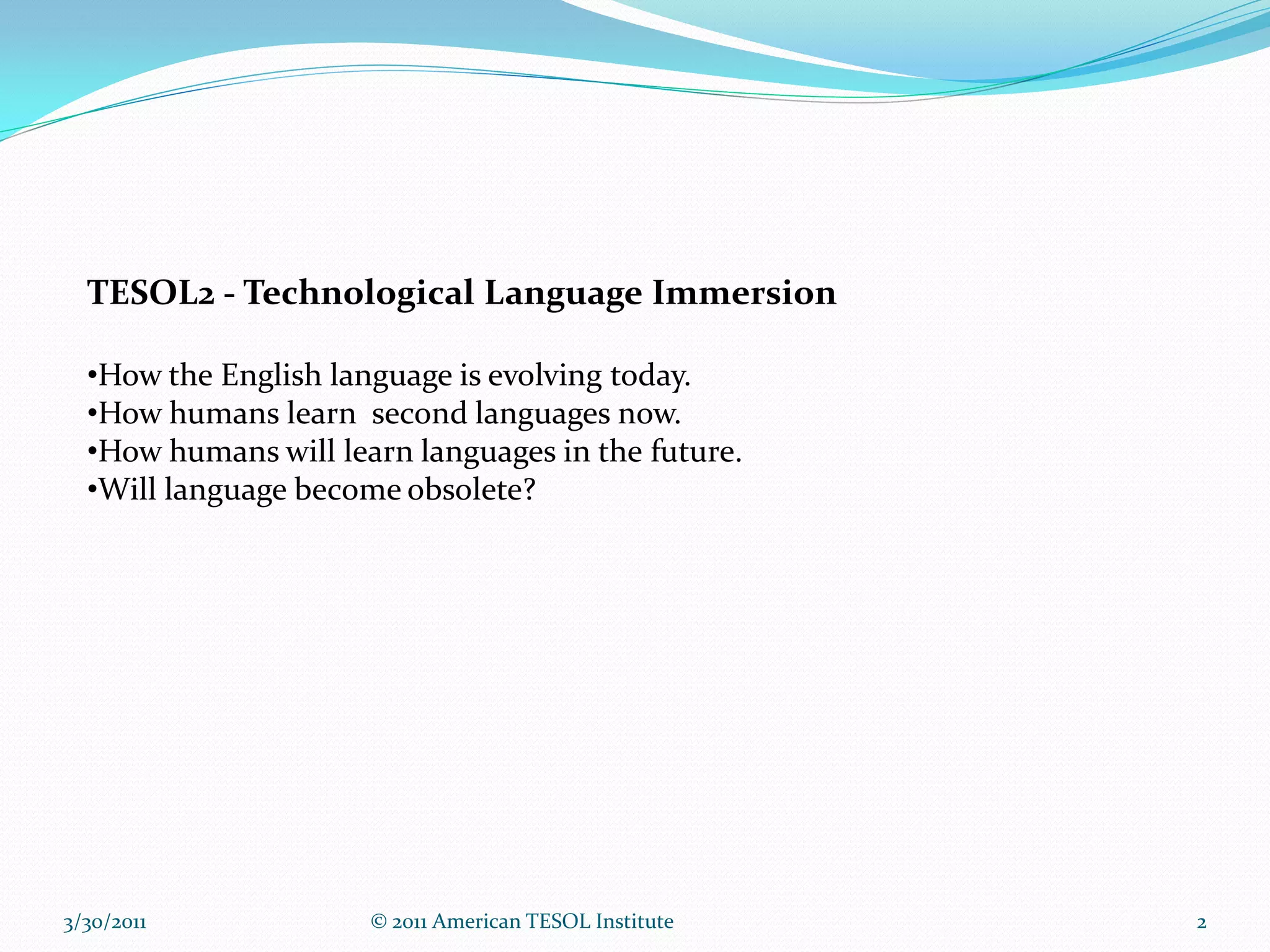 The document discusses the evolution of the English language in the context of technology, suggesting a shift towards 'panglish' due to influences from various local languages. It outlines traditional methods of learning a second language and introduces the concept of technological language immersion, which may lead to future learning through advanced tools like nanocomputers. Ultimately, it raises the possibility that language could become obsolete as communication evolves into a universal code facilitated by human-computer symbiosis.