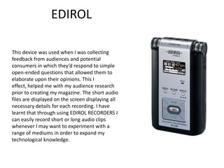 The document discusses various technologies the author learned about through creating a music magazine project. The author recorded audio clips using an Edirol recorder to collect audience feedback. Adobe Audition allowed editing of audio files, such as deleting unwanted background noise. A blog platform like Blogger made it easy to publish posts and receive feedback. A USB stick stored all work files. PowerPoint and SlideShare helped create and share presentations. Adobe Photoshop was used extensively to manipulate images, such as cropping, changing colors, and adding effects to create the desired aesthetic for presenting an artist. Learning to use these technologies helped improve the author's skills and create a more professional product.