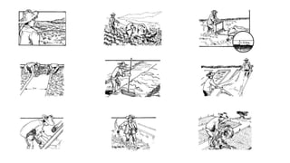 The document discusses several farming methods including dapog nursery farming and hydroponics. Dapog nursery farming involves growing seedlings on plastic sheets or banana leaves placed over raised seedbeds, without soil. This saves time and space compared to traditional nursery methods. Hydroponics is described as growing plants without soil by using nutrient solutions, allowing for less water and space usage. Other topics covered include advantages of poly mulching, uses of hydrogels to retain water for plants, and a brief overview of paddy transplanters used in rice farming.