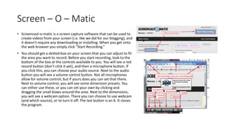 Screencast-o-matic is a free screen recording software that allows users to create videos from their computer screen without needing to download or install anything. It provides controls to select the recording area, choose an audio source and adjust volume, and optionally include webcam footage. To record, users click the record button which will count down and then capture everything within the selected area until the stop button is pressed. Once finished recording, users can preview their video and then choose to publish it to sites like YouTube.