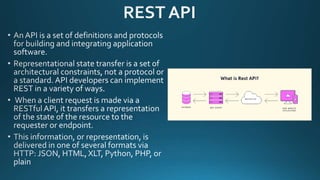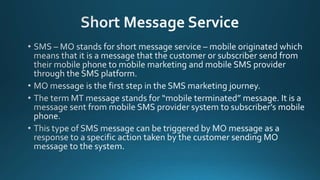 The document discusses application-to-person (A2P) and person-to-application (P2A) messaging. A2P messaging involves applications sending messages to users, like marketing messages or appointment reminders, while P2A involves users initiating messages to applications, like for competitions or subscriptions. The document also covers SNMP for network monitoring, web services using XML, and differences between GraphQL and REST APIs.