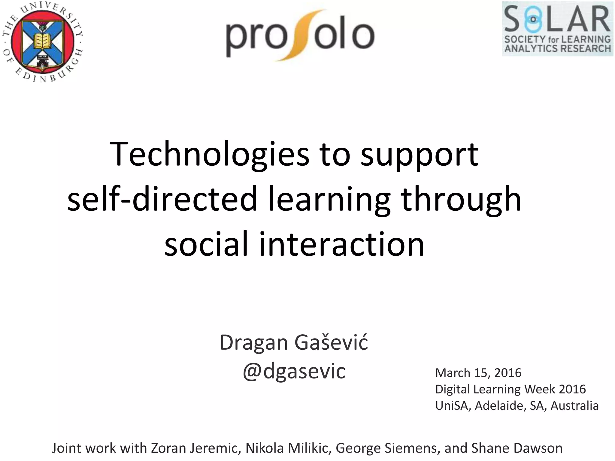 The document discusses the role of technologies in facilitating self-directed learning through social interaction, emphasizing the need for personalized learning approaches that cater to diverse student needs. It highlights the importance of feedback, effective instructional design, and social aspects of learning while addressing challenges in current educational frameworks. The ProSolo platform is introduced as a tool for implementing these concepts through technological scaffolding and learning analytics.