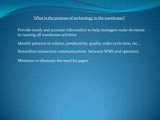 The document discusses technologies used in computerizing warehouse operations to streamline processes and minimize errors. It describes how identification technologies like barcodes, RFID, and smart cards work with communication systems using radio frequency, synthesized voice, displays, and pick-to-light systems to provide operators real-time information paperlessly. The bullwhip effect is explained as variations in customer demand amplifying as orders move up the supply chain due to forecasting errors and companies carrying buffer stock.