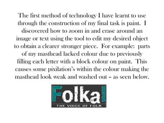 The document discusses three technologies the author learned to use during the construction of their final project. They learned to use the zoom and erase tools in Paint to precisely edit images. They also learned to use Photoshop's cropping tools to cleanly cut out images and place them on white backgrounds. Finally, they learned to use SlideShare to upload PowerPoint presentations and copy the HTML to include the slides in their blog.