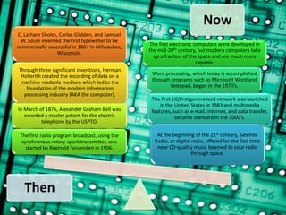 This document summarizes the history and development of technology across several domains including communication, motion pictures, and architecture from the 19th century to present day. Key milestones and inventions are noted for each domain, showing steady advancement over time from early pioneers to modern innovations. Quotes discuss how new technologies like the telegraph and internet have accelerated the speed of news distribution and how America has transformed journalism.