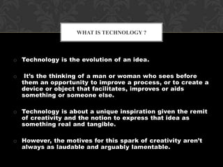 The document discusses various aspects of technology including its definition, evolution over generations of computers, and applications in transportation, circuits, medical devices, security, and industries. It also notes some drawbacks of technology such as weapons development and misuse of leisure time. Key points made include that technology is the evolution of ideas to improve processes and create useful devices, and that while technology has benefits, it also enables harmful consequences if not used responsibly.