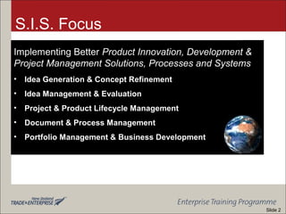 This document provides an overview of a presentation on delivering competitive exports when exchange rates are equal between currencies. It discusses idea generation and product development processes. It emphasizes strategic alignment of business priorities with opportunities through identifying customer needs and formulating strategies. A product-market matrix outlines different strategies like market penetration, development, product development, and diversification. Effective project management is key to avoiding downward spirals from issues like poor prioritization. A phase-gate product development process and portfolio management are presented as tools to manage projects and resources effectively.