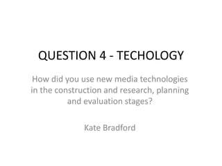 Kate Bradford used various new media technologies throughout the research, planning, construction, and evaluation stages of her film trailer project. She utilized blogs, social media platforms, online presentation tools, photo/video editing software, and communication/collaboration apps. Specifically, she mentions using Blogger, Twitter, Pinterest, YouTube, SlideShare, Emaze, PicMonkey, Google Docs, Facetime, WhatsApp, GIFs, digital cameras, Adobe After Effects, and Adobe Photoshop. These tools allowed her to research examples, share work, receive feedback, plan collaboratively, edit/transform media, and present her final project in an engaging format.