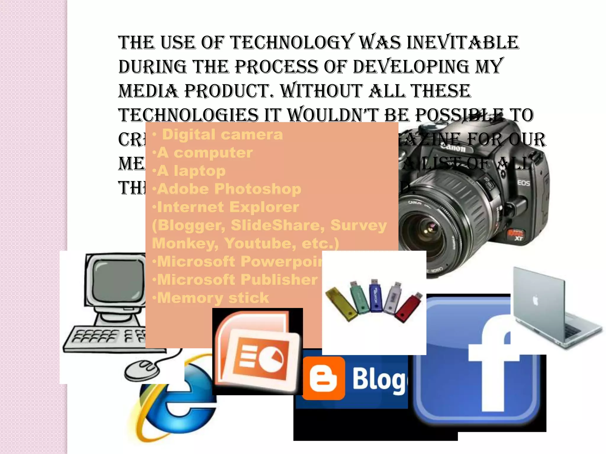 The document summarizes the technologies used and skills learned in creating a magazine for a media course. Key technologies included a digital camera, computer, laptop, Photoshop, internet browsers, PowerPoint, Publisher, and memory stick. The creator gained experience using Photoshop tools like layers, blending, and cropping. Communication technologies like SurveyMonkey, Facebook, and Blogger helped with audience research, collaboration, and project sharing. Tutorial videos on YouTube supported learning Photoshop and camera skills.