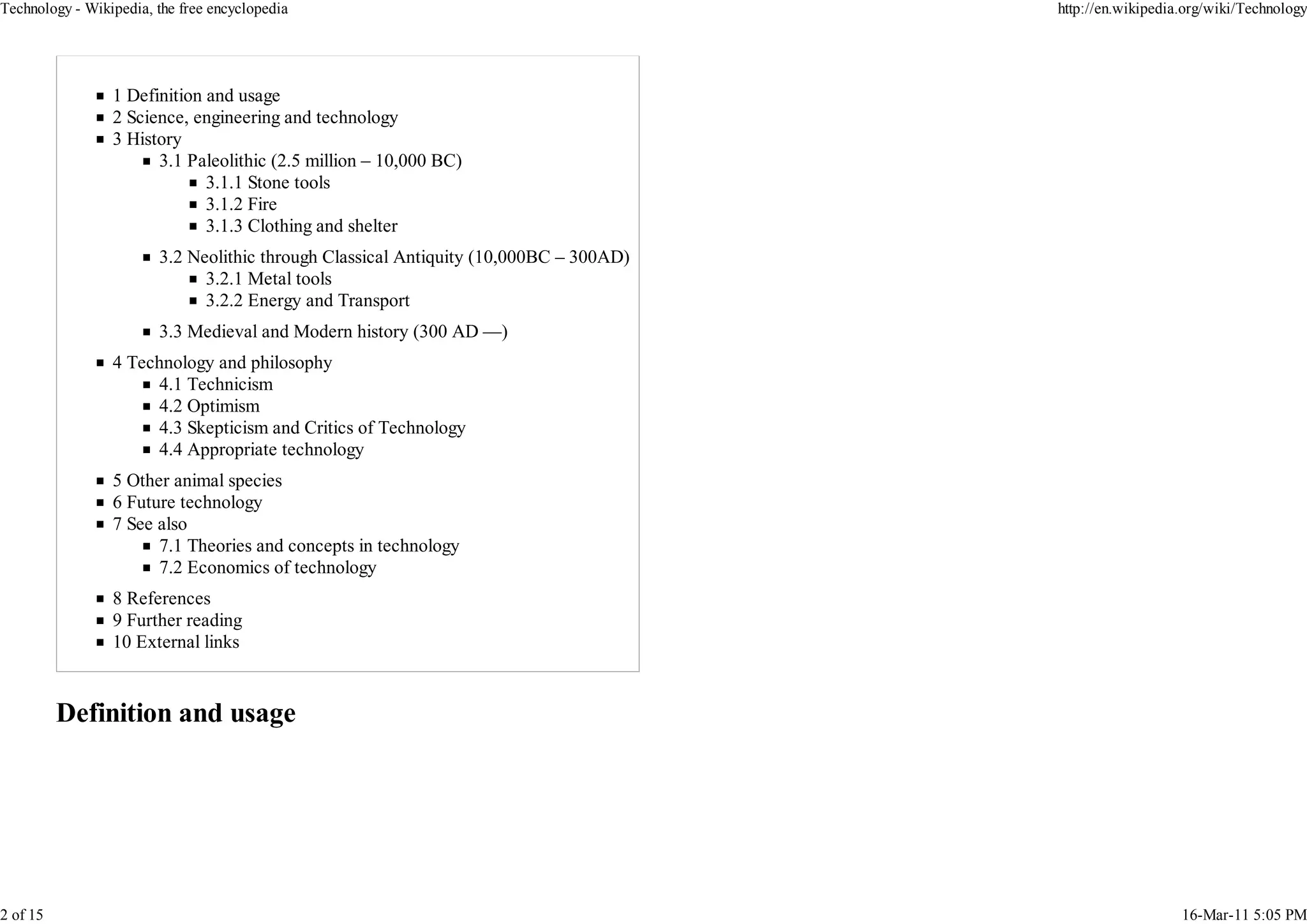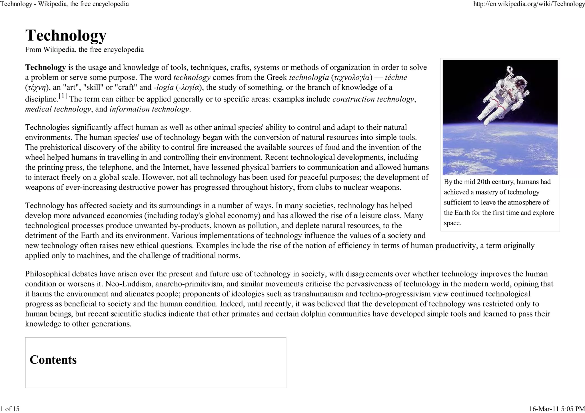 Technology refers to the application of knowledge and tools to solve problems and serve human purposes. It includes engineering, machines, and techniques used in various fields like construction, medicine, and information technology. Major technological developments have lessened physical barriers and allowed humans to interact on a global scale, though technology has also enabled weapons and pollution with environmental impacts. Philosophical debates exist regarding technology's effects on humans and societies.