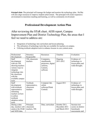The second section describes a professional development plan to increase teachers' technology integration. Teachers will receive training from the Campus Technology Integration Specialist and textbook representatives on using available tools. Data days will help teachers identify areas to address using technology. Progress will be evaluated through lesson plans, observations, surveys and test scores.