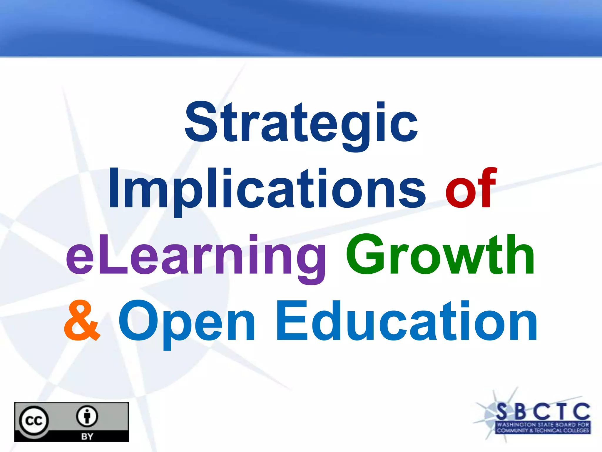 The document discusses the growth of eLearning and open education in Washington community and technical colleges. It notes that eLearning enrollments increased 31% between 2008-2009 and 2009-2010, accounting for 58% of total enrollment growth. Open education aims to increase access and completion through affordable openly licensed educational resources like an Open Course Library of 81 high-enrollment courses costing students less than $30 for textbooks. The benefits of open education include improved completion rates, lower costs, and engaging in the global discussion of open educational resources.