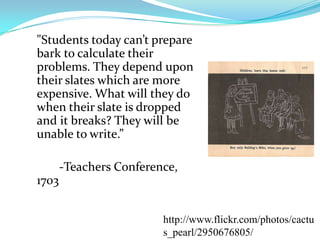 Over the past 300 years, teachers and administrators have consistently expressed concern that new technologies will make students dependent and unable to cope without them. Early criticisms focused on slates, paper, ink and pens. Later concerns involved fountain pens, ballpoint pens and handheld calculators. While technologies changed over time, the underlying worry about student dependence on the latest tools remained the same. The document suggests this pattern will likely continue with future changes.