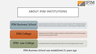 The document discusses the evolution of education and the impact of technology on learning, stating that institutions like IFIM are adapting to these changes by embracing personalized and competency-based curricula. It emphasizes the shift from traditional lecturing to mentoring and facilitating learning, alongside the rise of micro and nano degrees, which cater to specific skills and continuous learning engagement. Ultimately, it underscores the necessity for educational institutions to evolve and stay relevant amidst the fast-paced digital revolution.