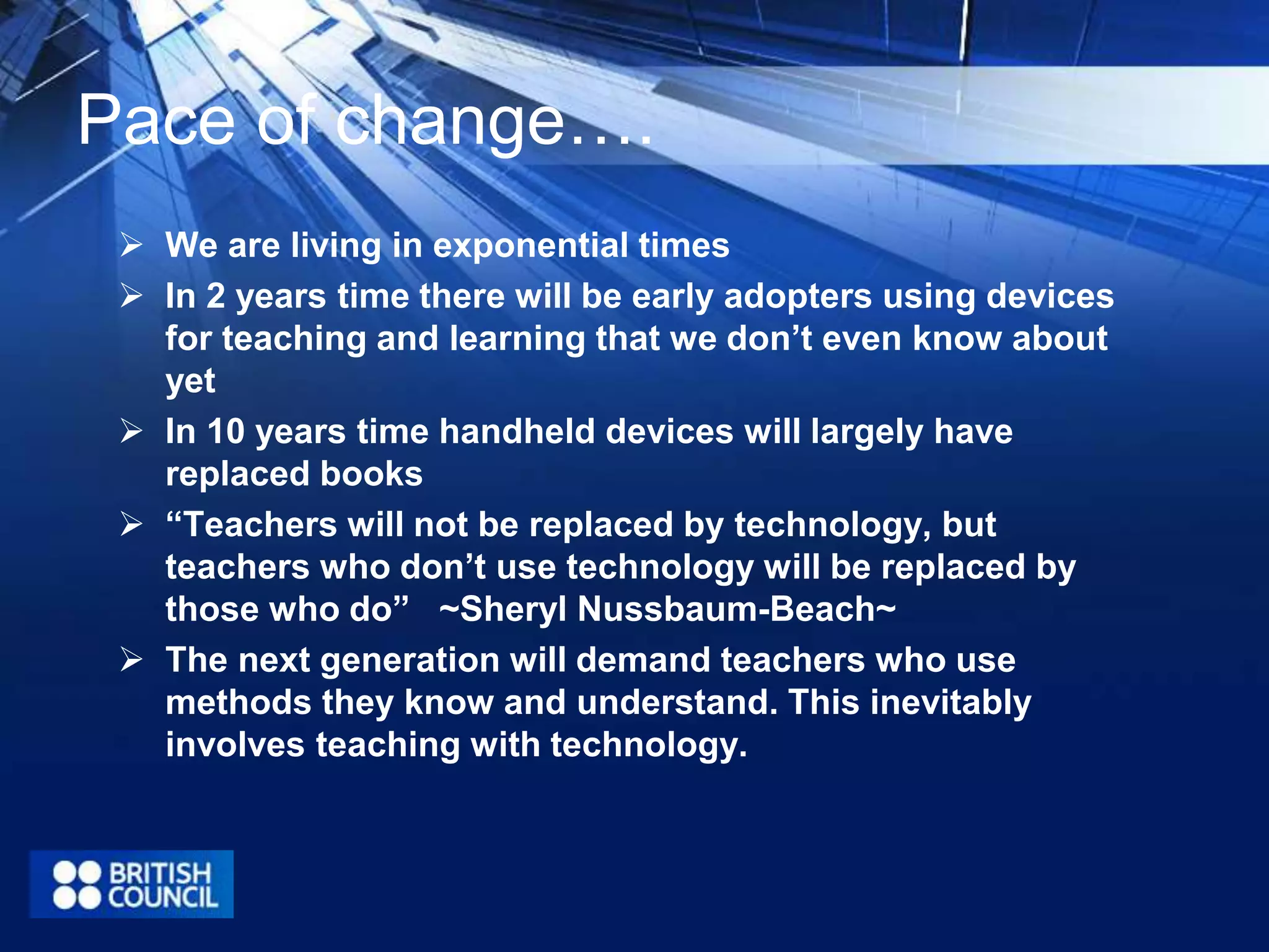 1) Technology is advancing rapidly and will increasingly be used for teaching and learning, replacing books within 10 years. Teachers must learn to use technology or risk being replaced.
