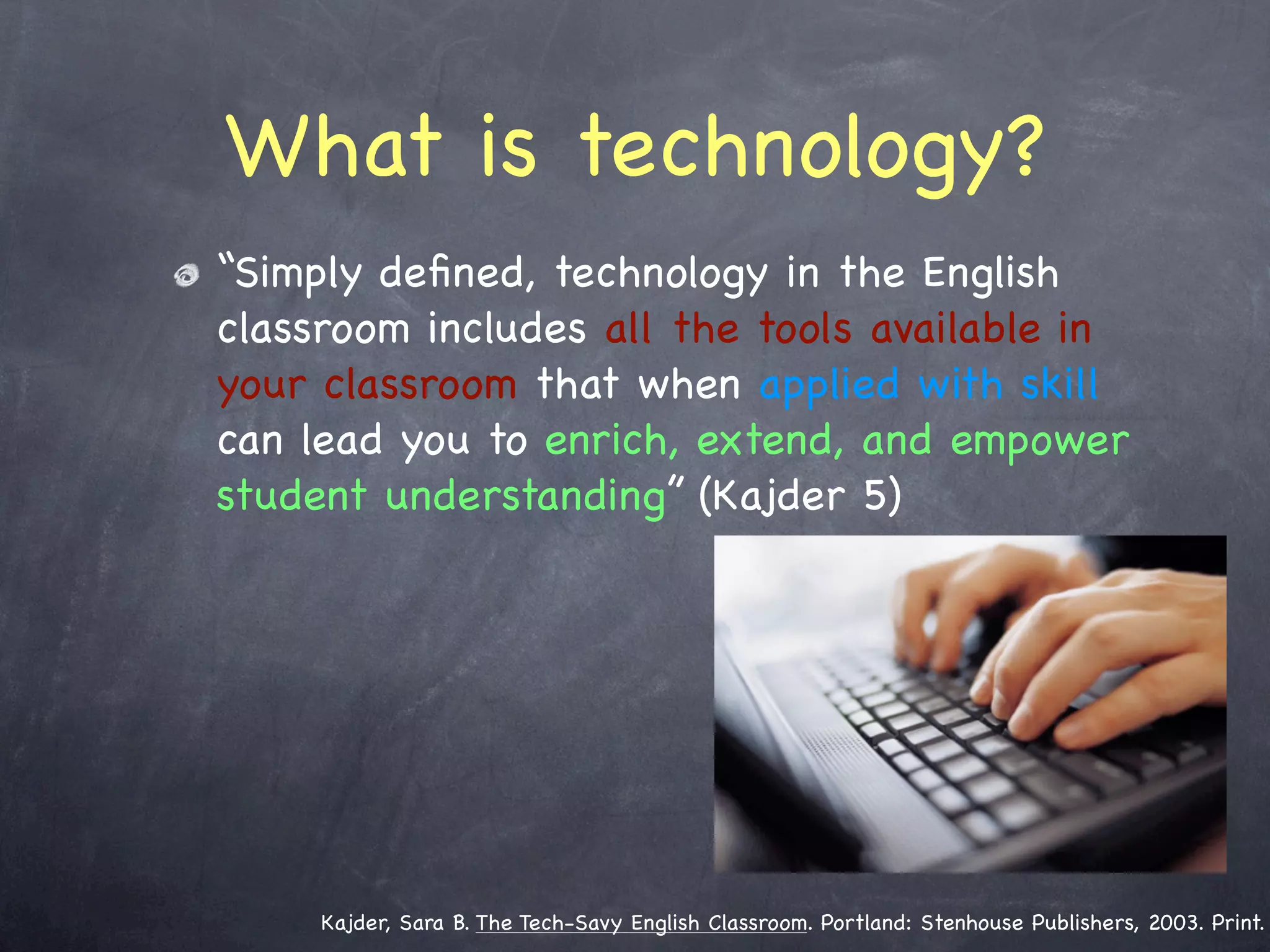 This document discusses using technology in the English classroom. It defines technology as tools that can enrich, extend, and empower student understanding when applied skillfully. The document encourages teachers not to fear technology, but to view it as a tool to enhance best practices. It advises determining if a technology provides a meaningful learning experience by considering the lesson objective. The document also recommends starting with objectives and Bloom's Taxonomy, using the writing process with technologies like brainstorming apps and blogs, and asking how a new technology can address an instructional problem or add value when encountering it.