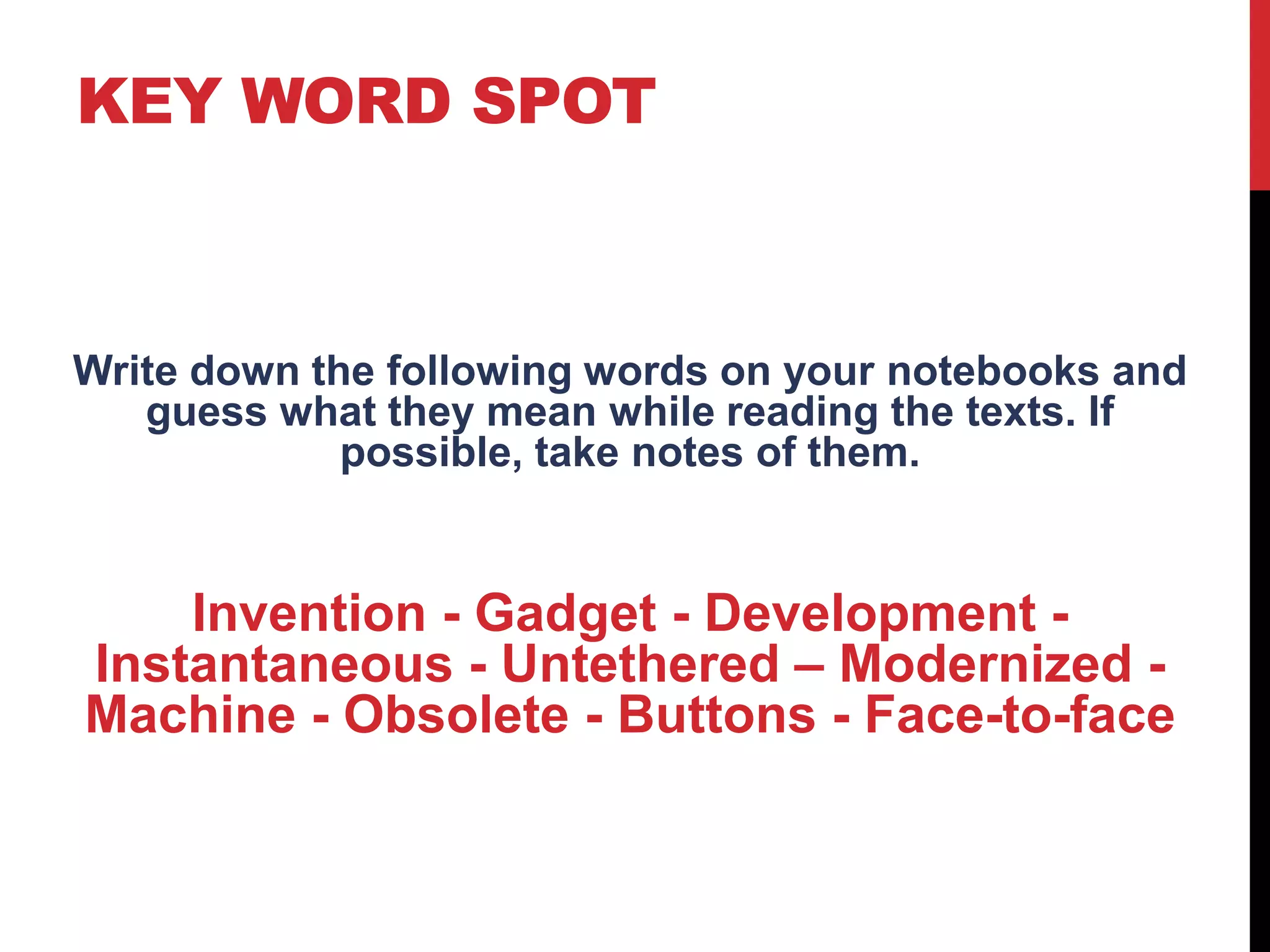 The document discusses technological inventions and their impact on daily life, emphasizing innovations from the wheel to modern gadgets like smartphones and GPS. It highlights several key technologies, including microwaves, personal computers, and the internet, noting their transformative effects on communication, convenience, and information dissemination. Additionally, the document includes vocabulary exercises and comprehension checks related to the technological developments discussed.