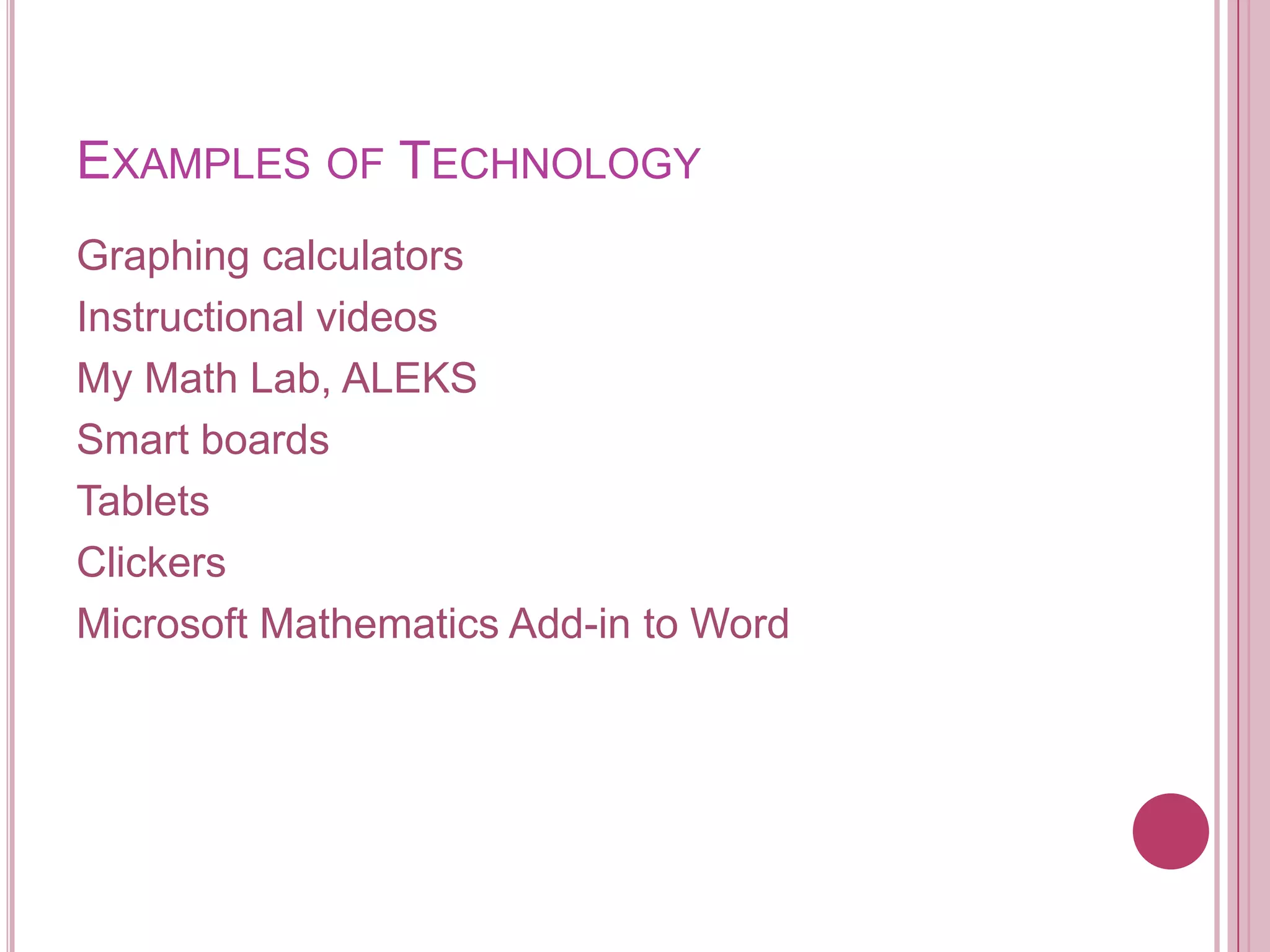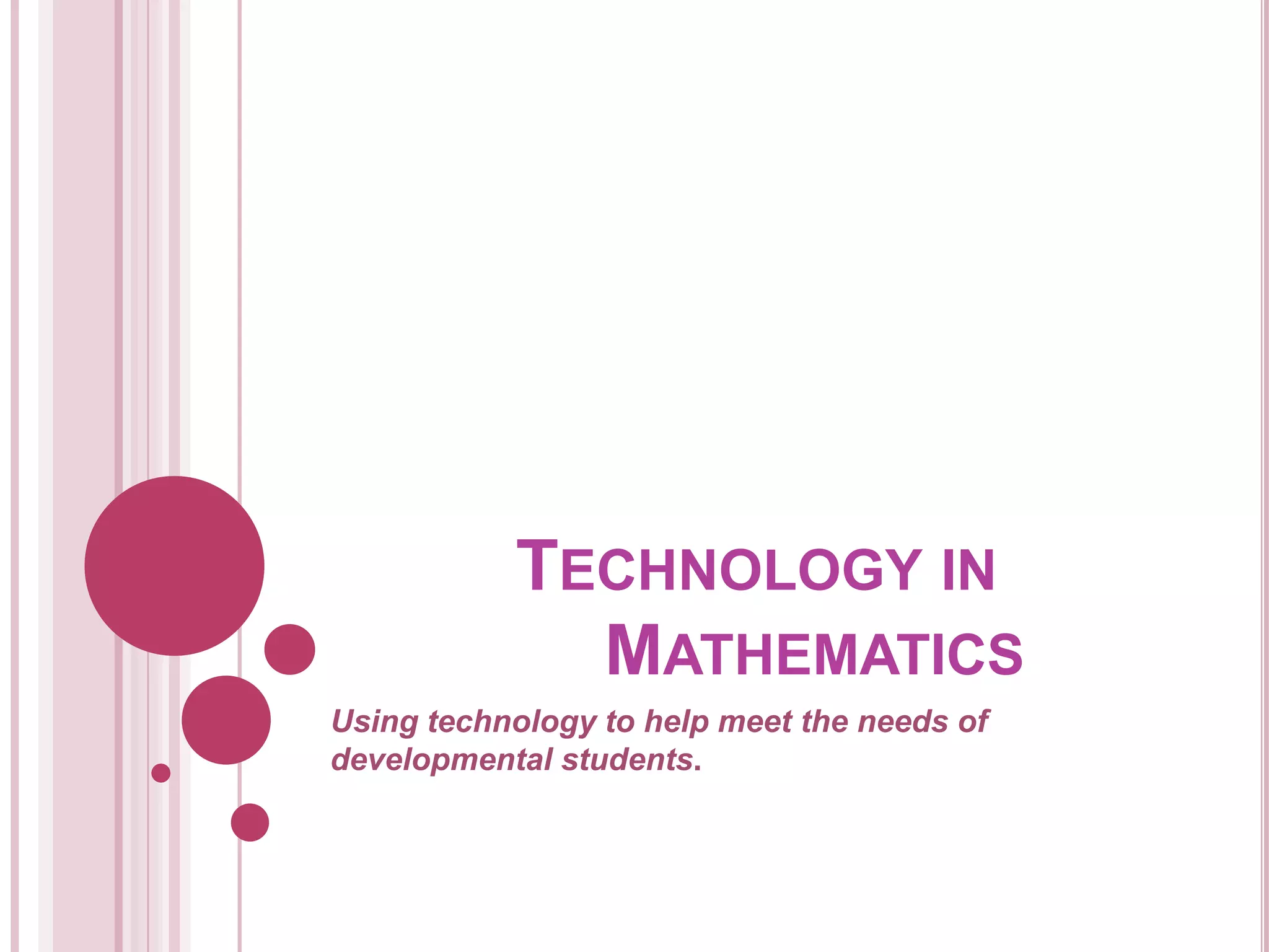 Technology plays an important role in developmental mathematics education. Examples of helpful technologies include graphing calculators, instructional videos, online platforms like My Math Lab and ALEKS, and interactive whiteboards. Studies show that integrating various technologies into the classroom and lab can help supplement instruction and support accurate placement of students. Some schools are experimenting with acceleration models that allow students to complete multiple developmental math levels in one semester using self-paced online platforms. While technologies offer benefits, simply using them as add-ons is not enough - developmental math courses need redesign to fully prepare students.