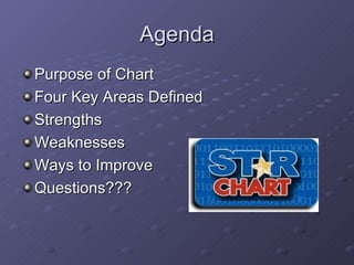 The document discusses a STaR Chart used at the school to assess technology readiness in four key areas: teaching and learning with technology, educator training and development, leadership and support, and infrastructure. It provides an overview of the chart's purpose for self-assessment and planning, outlines the school's current strengths in educator training and weaknesses in infrastructure, and seeks questions on using the chart as an improvement tool.
