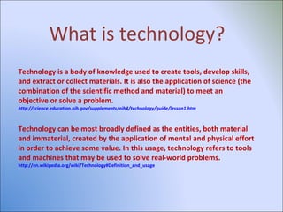 The document discusses technology and its role in second language acquisition. It defines technology as the application of knowledge and skills to develop tools that solve problems. The document then outlines some advantages and disadvantages of using technology for second language learning. Key advantages include increased exposure to the target language, opportunities for practice, and greater motivation. Disadvantages include lack of access for some students and imperfect software.