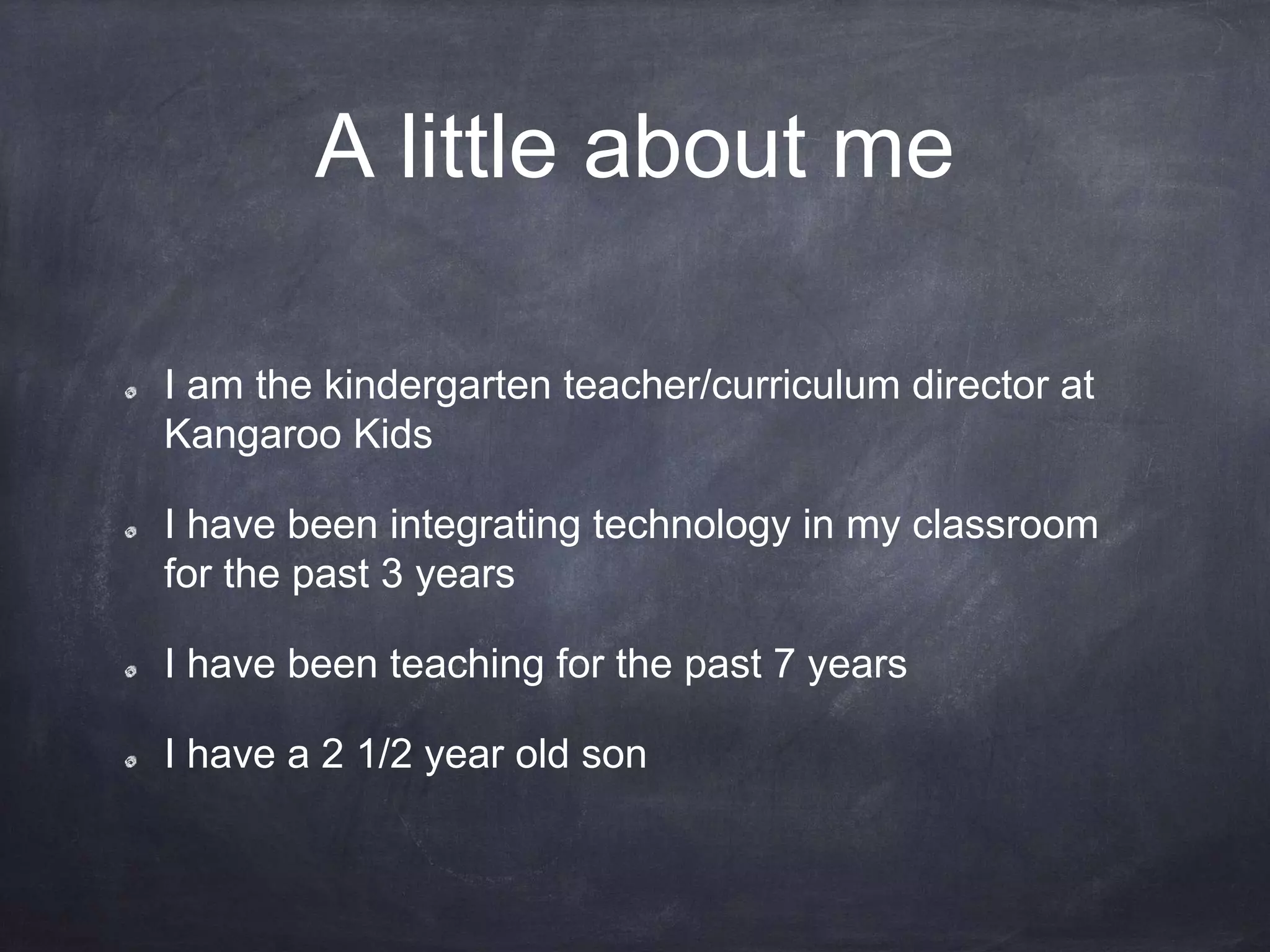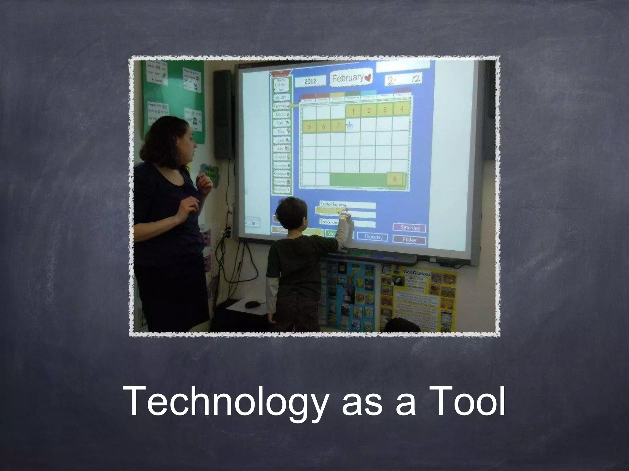 This document discusses using technology as a tool in the classroom. The author is a kindergarten teacher who has been integrating technology for 3 years. She uses a camera, smart board, and iPads/iPhones in her classroom to document lessons, engage students, and communicate with parents. The document provides examples of how each technology tool is used and recommends developing a plan to set goals and measure the impact of integrating technology.