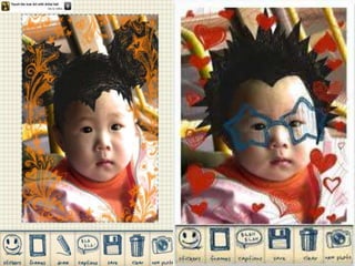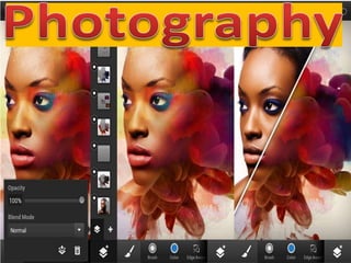 Technology-based art uses computers and digital tools to create and manipulate images rather than traditional materials like paint and brushes. It includes digital photography, digital painting, computer-generated images, and videos created on computers or mobile devices. Modern smartphones and tablets have powerful editing apps that allow users to easily create and share artworks by adding effects, filters, animation and more. Common apps include Photoshop Express for editing, PicCollage for collages, ArtStudio for doodling, and Animoto for short videos set to music. While basic adjustments don't make an image fully computer-generated, extensive manipulation and creation with computers and software do constitute technology-based art.