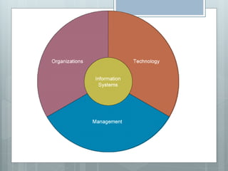 This document provides an overview of information systems. It defines an information system as any combination of information technology and people's activities that support operations, management, and decision making. An information system collects, processes, stores, analyzes and disseminates information for a specific purpose. It discusses the key components of an information system including interfaces, sub-systems, boundaries, and environment. It also categorizes different types of information systems such as transaction processing systems, management information systems, decision support systems, and executive information systems. Finally, it provides examples of information system implementations in areas like finance, marketing, production and human resources management.