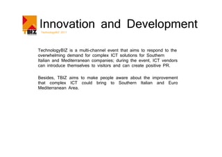 TechnologyBIZ 2011 (TBIZ) is a multi-channel event being held on November 8-9, 2011 in Naples, Italy that aims to promote innovation and development of complex ICT solutions for Southern Italian and Mediterranean companies. The third edition of TBIZ will feature meetings, seminars, workshops and conferences on topics like Green IT, business intelligence, ERP systems, social media, and more. Over 3,300 people have already registered to attend TBIZ 2011 to learn about new technologies and network with others.