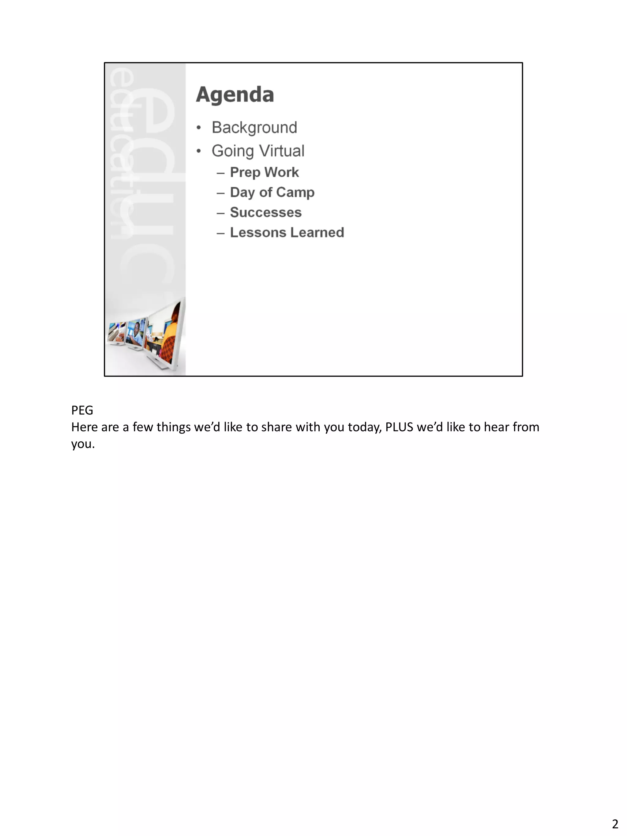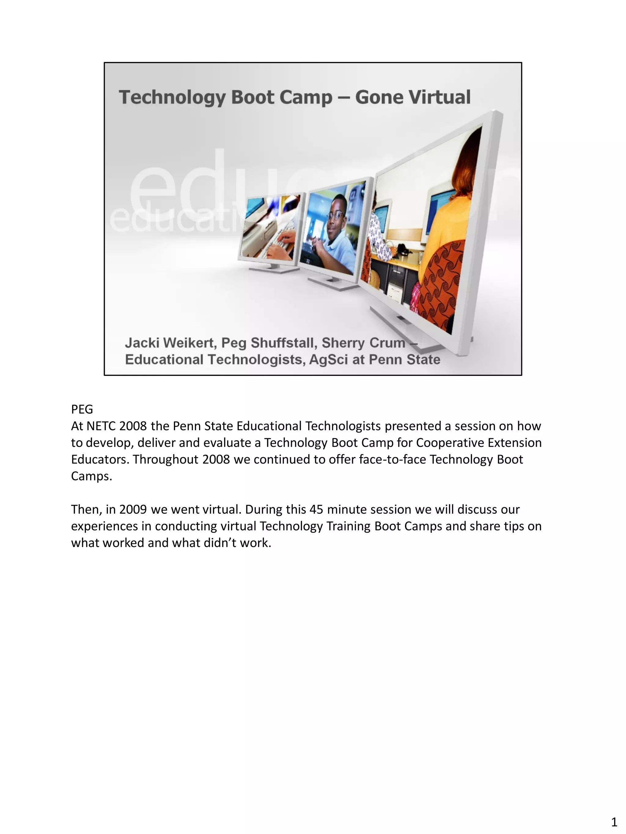The document discusses the experience of offering virtual technology boot camps for Cooperative Extension Educators. Previously, face-to-face boot camps were held around the state and covered various topics through hands-on activities and demonstrations. Due to reduced travel budgets, virtual boot camps were offered in 2009. Two virtual boot camps were held in June and December 2009 on topics such as computer practices, SharePoint, and photo manipulation. Participant feedback indicated that while the virtual format saved travel time, hands-on learning was less effective than in a computer lab. Limiting class sizes and offering beginner and advanced levels were suggested for improvement.