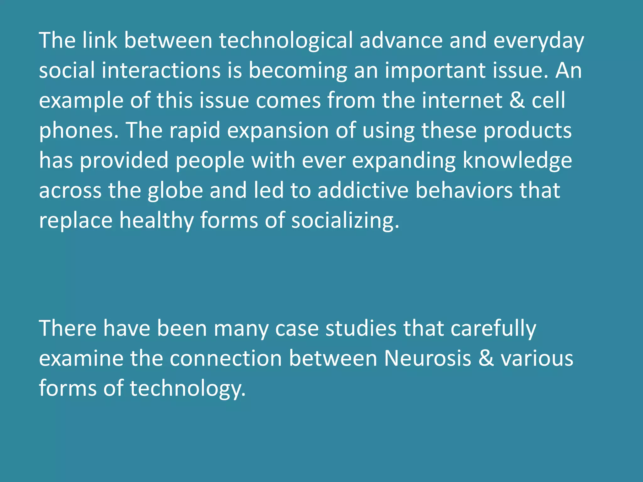 The document discusses the link between technology use and social isolation/neurosis. Ever-expanding internet and cell phone use has replaced in-person social interaction, potentially leading to addictive behaviors. Studies show a connection between various forms of technology and neurosis, which involves stress, anxiety, mood changes, and physical symptoms. While technology connects people globally, it has also made it easier to avoid real-world social and emotional problems. Increasing online communication and remote work can enable isolating lifestyles. Seeking professional help is important to avoid ignoring or exacerbating issues related to social isolation and neurosis brought on by technology use.