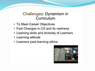 This document discusses technology challenges and skills for computer science students. It outlines the objectives of imparting necessary technical skills, developing soft skills and leadership abilities, and channeling students' vision towards career opportunities. It also discusses evolving societies from agricultural to industrial to knowledge-based. Key skills highlighted for computer science students include having strong logical and mathematical foundations, challenging oneself, getting involved with peer groups, staying calm under stress, being creative, branching out knowledge, extensive reading and writing of code, understanding tools, and learning from failures. The document emphasizes on personality development through improving communication, dressing professionally, changing behaviors, taking up sports, and developing hobbies. It also discusses reliance on networked IT services and changing job roles with new jobs