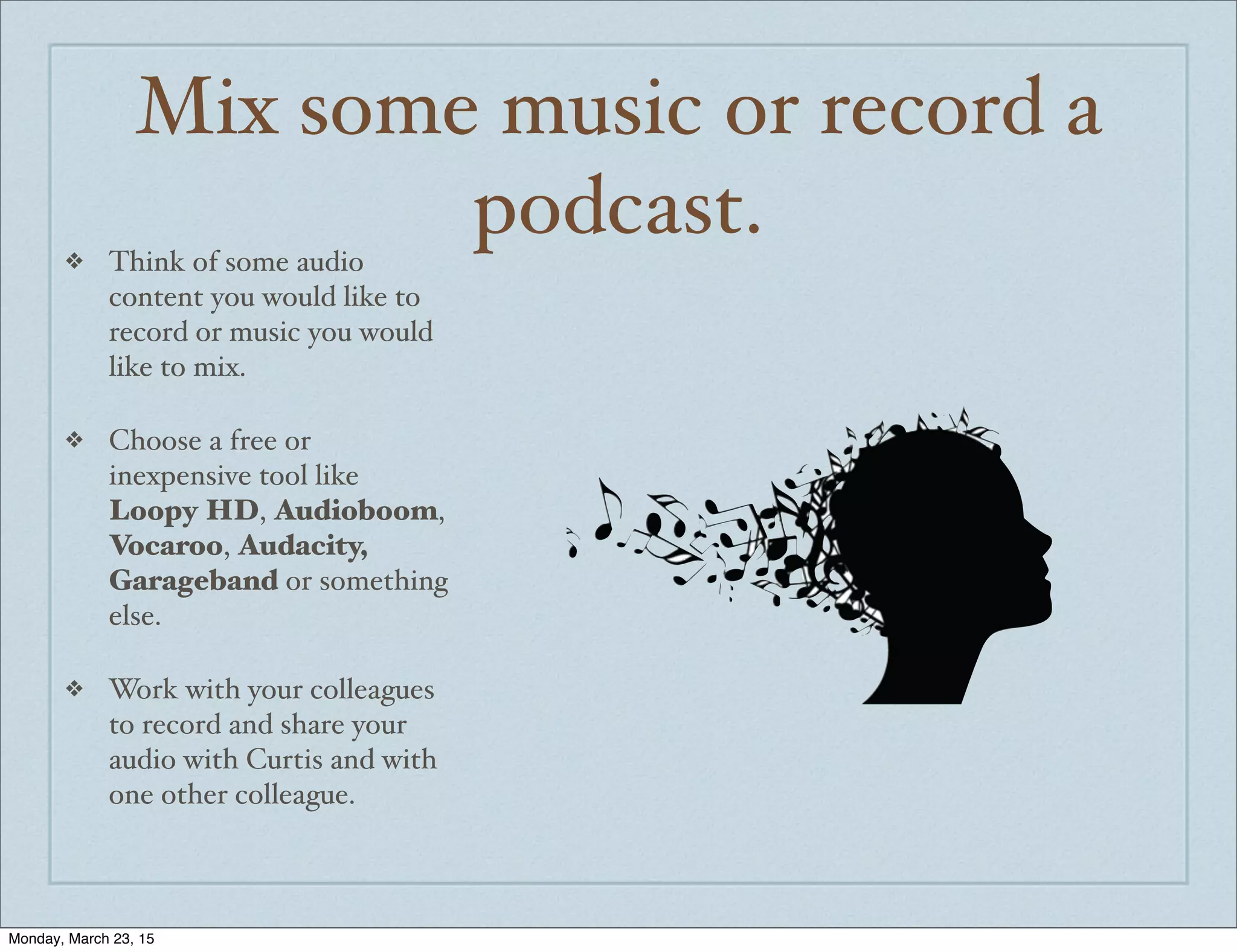 The document provides suggestions for activities teachers can do to engage students using digital tools. It suggests creating audio recordings or mixing music using free audio tools. Another suggestion is to gamify a quiz or activity using tools like Kahoot or Socrative. Additional ideas include creating short videos, infographics, interactive video lessons, animations, 3D models, digital stories, interactive maps or timelines, or using another unfamiliar digital tool. All activities should be shared with colleagues.