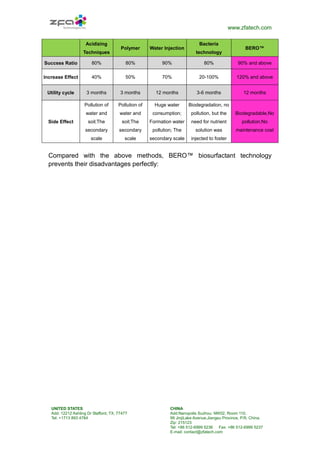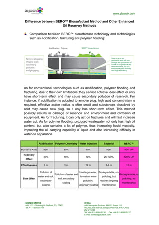 This document compares BEROTM biosurfactant technology to other enhanced oil recovery methods such as acidification, polymer flooding, fracturing, and microbial enhanced oil recovery technologies. It finds that BEROTM has higher success rates, recovery effects, and effectiveness than other methods, does not cause pollution, and requires no maintenance. It also details how BEROTM specifically targets reservoirs to reduce interfacial tension and remove plugging, making it more efficient and stable than endogenous microbial recovery technologies. The document concludes that BEROTM biosurfactant is the best global method for improving oil recovery rates and solving pollution problems during oil production.