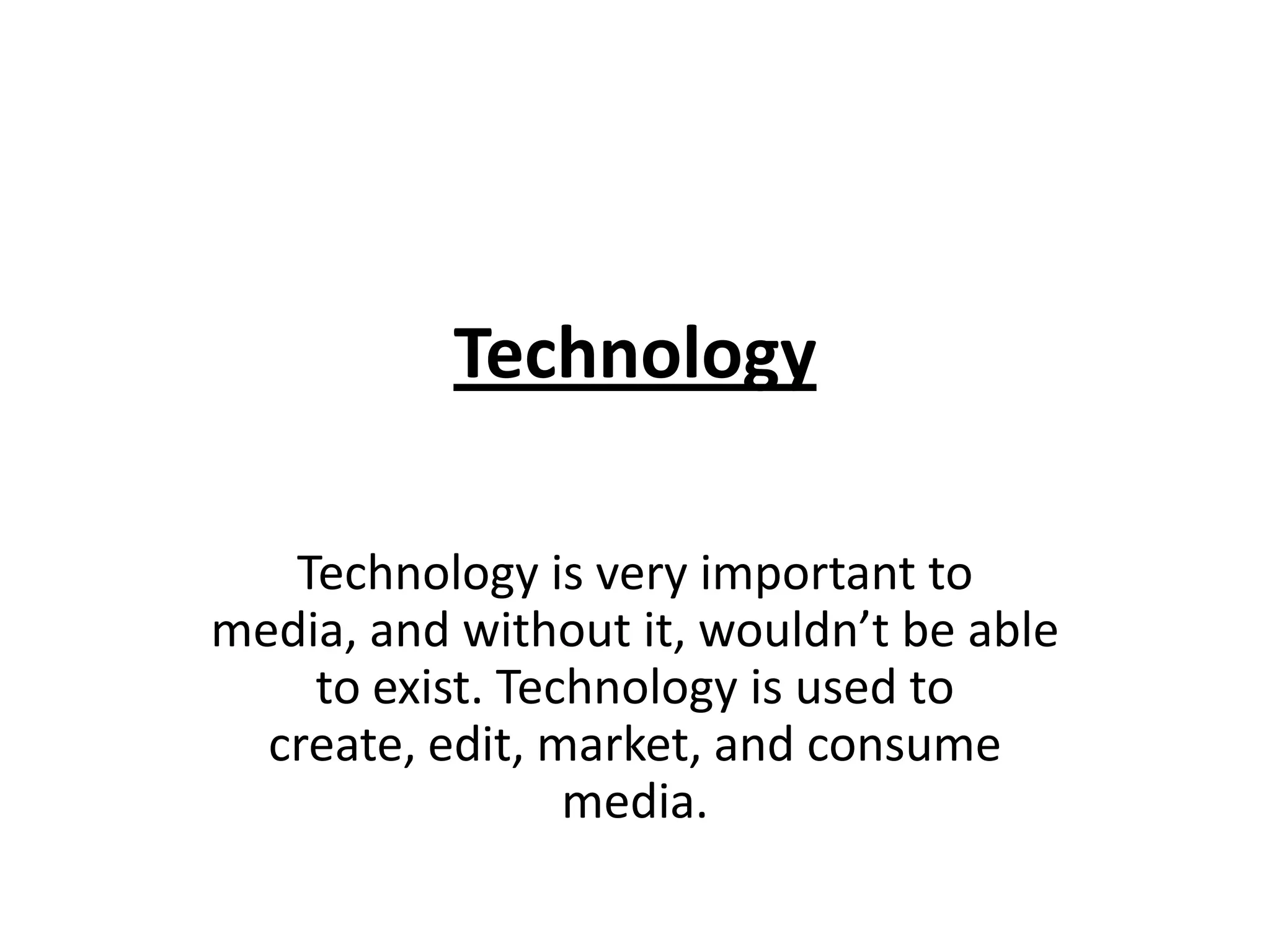 Technology is crucial for media production, editing, and consumption. For their music video animation project, the group used Microsoft Paint to create images, Photoshop to add effects, and Premiere to edit the footage into a timeline synced to music. While technology sped up production and editing, older computers hindered progress. Consumption of media has also changed drastically with services like iTunes and YouTube, as well as piracy, allowing easy access without physical media or radio. Feedback is now gained through social networking on the internet.