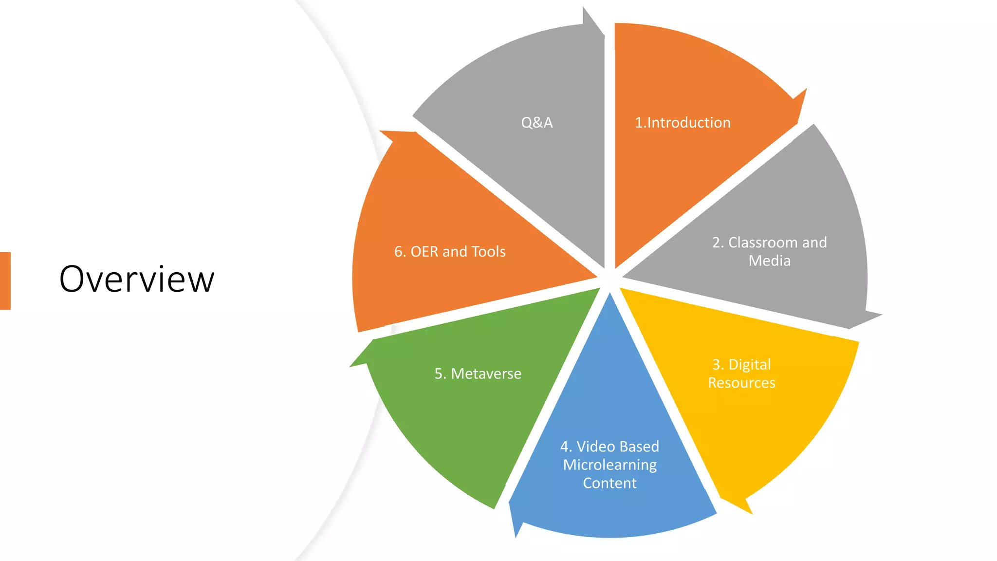 The document outlines the integration of technology in education, focusing on elements like digital resources, video-based microlearning, and the metaverse. It discusses various instructional design methods and types of digital content, including interactive videos and micro-credentials. Additionally, it highlights emerging trends in digital health and advanced technologies in the educational landscape.