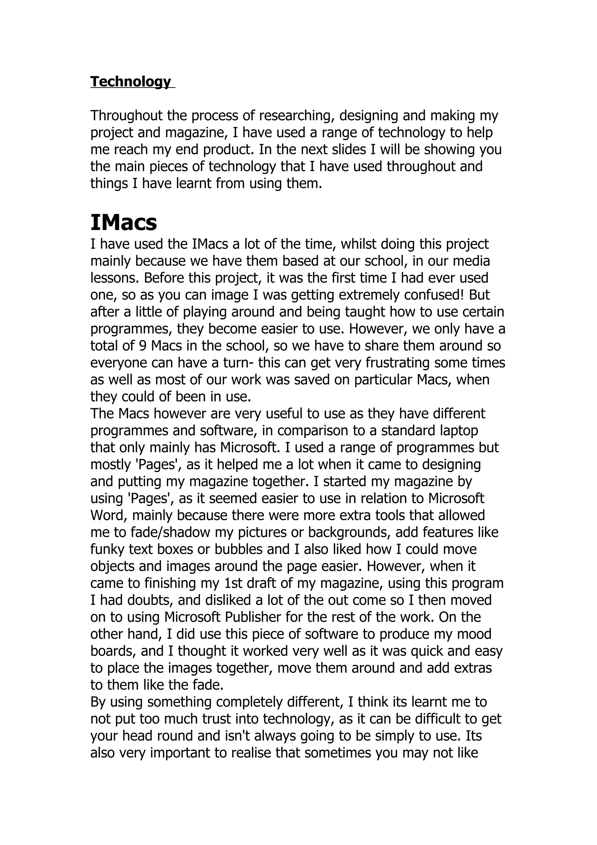 The document discusses the author's use of technology, specifically IMacs, in creating a school project and magazine. The author details using the school's IMacs and learning to navigate new programs like Pages. While Pages helped with design elements, the author disliked the outcome and switched to Microsoft Publisher. The author learned that technology can be difficult to learn and use, and programs don't always transfer work seamlessly between each other. Overall, the experience showed the importance of using programs you understand to avoid wasting time.