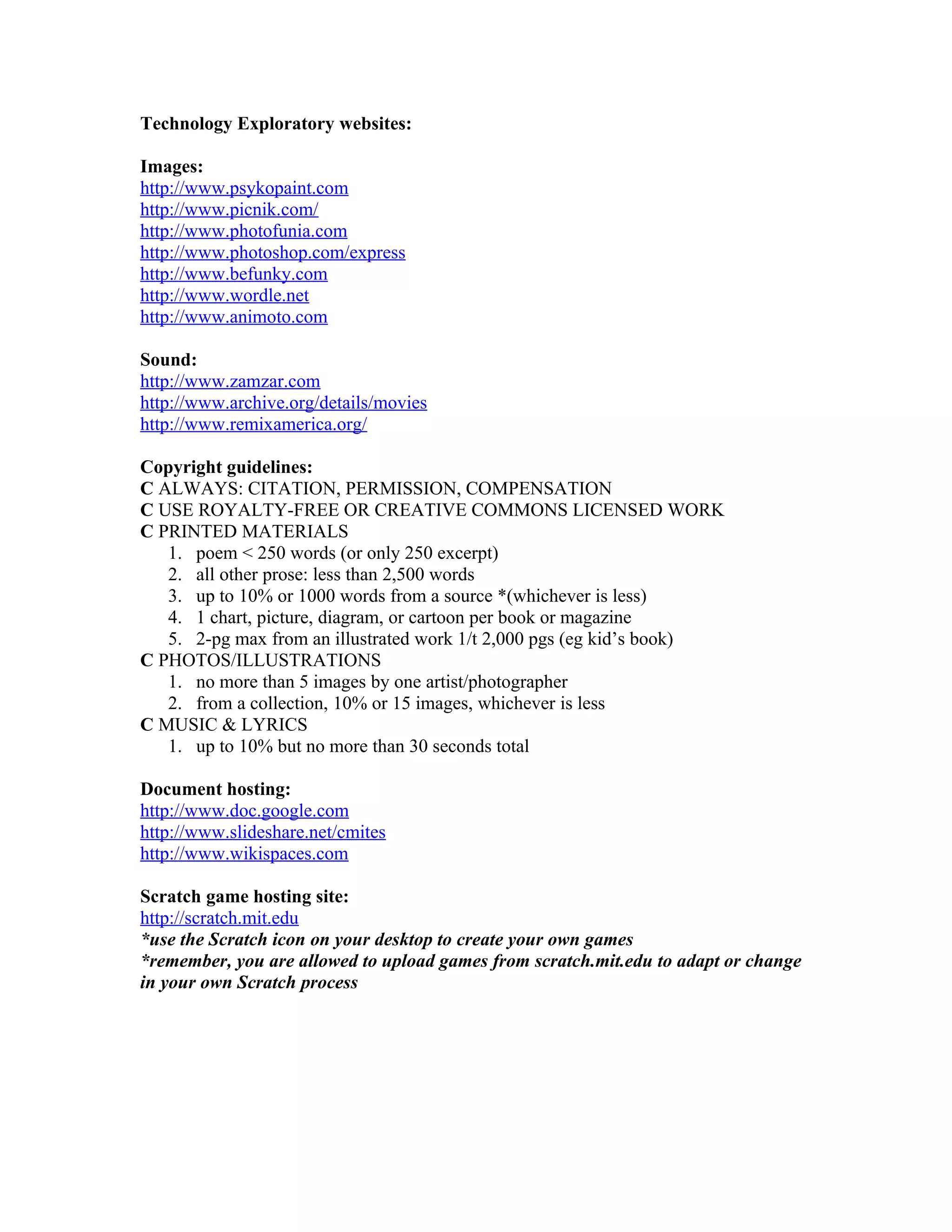 The document provides a list of technology exploratory websites for images, sound, and document hosting, such as Psykopaint and Google Docs. It details copyright guidelines for using various types of content, including rules for poems, prose, images, and music. Additionally, it mentions Scratch as a platform for game creation and modification.