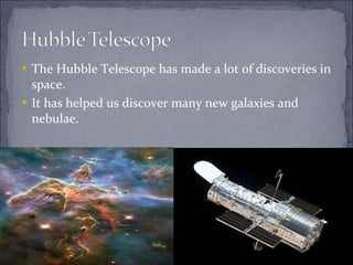 The Hubble Telescope has helped discover many new galaxies and nebulae. The International Space Station helps experiments that can aid exploration of the moon and Mars. Space probes send unmanned ships to planets like the moon and Mars to gather information safely from their surfaces and send it back to Earth for analysis.