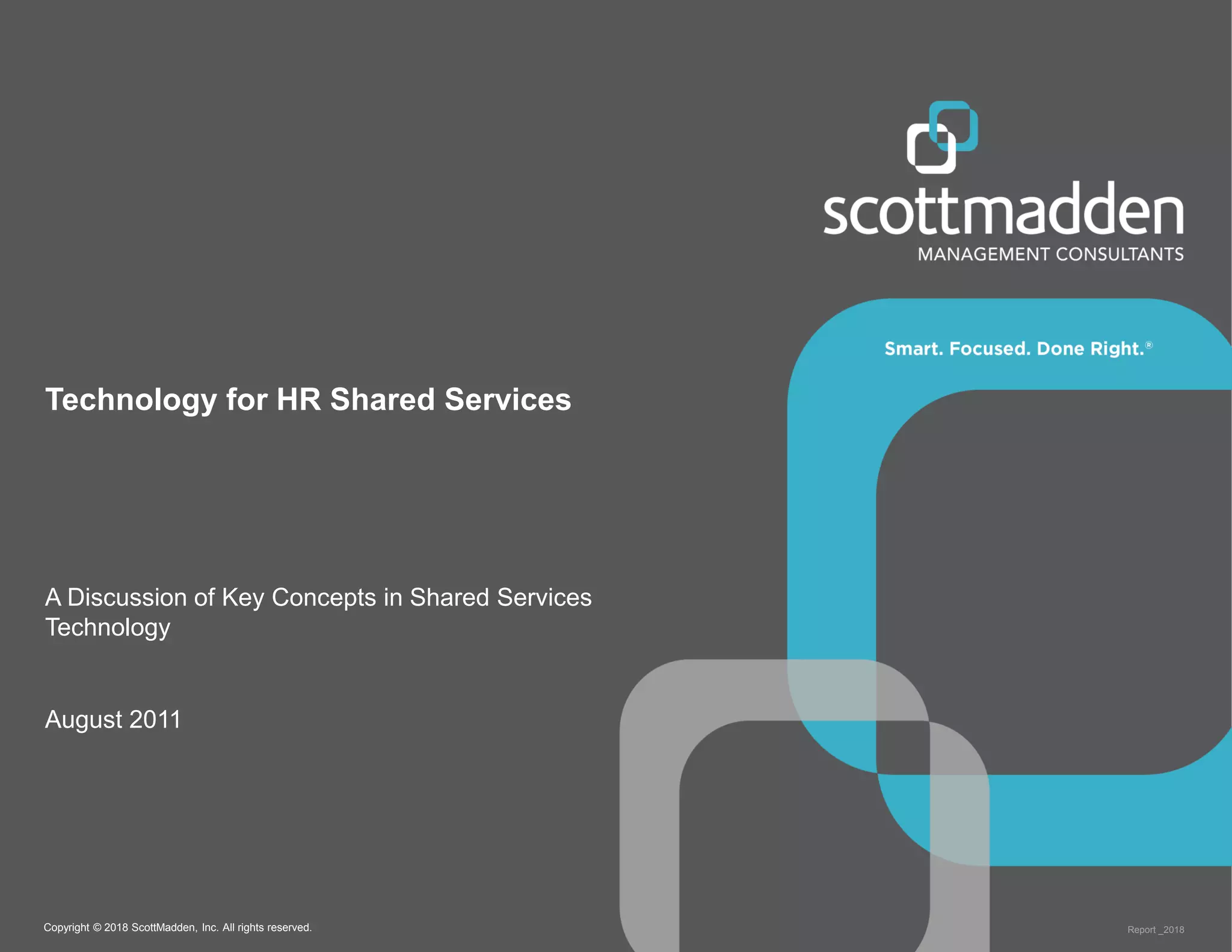 The document discusses key concepts in HR shared services technology, focusing on the design, evaluation, and selection of technology for HR functions. It outlines various categories of HR technology, trends in the field, and a structured approach for technology decision-making, including forming a dedicated technology team and conducting thorough evaluations. Additionally, it highlights lessons learned from past implementations to ensure successful adoption of technology solutions.