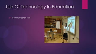 This document discusses the use of technology in education. It outlines goals of changing how teachers teach and interact with students. It explores pros and cons of using technology for student exploration and lesson integration, noting how it can engage students but also lead to distraction or require significant teacher planning. Costs of technology are addressed, including expenses of equipment, replacement, and support staff. Training teachers and students to use technology is also discussed as beneficial but time-consuming. The document concludes by noting technology allows teacher tools for record keeping and communication.