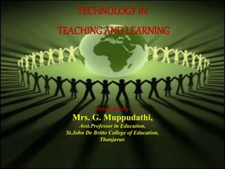 The document, presented by Mrs. G. Muppudathi, discusses the role of technology in education, defining educational technology as the development and application of systems to enhance learning. It outlines objectives such as improving information transmission, skill practice, and feedback provision, while emphasizing the need for appropriate teaching strategies and materials. The text also highlights best practices for using technology in classrooms, including alignment with educational goals, accessibility, and reinforcement of teaching methods.